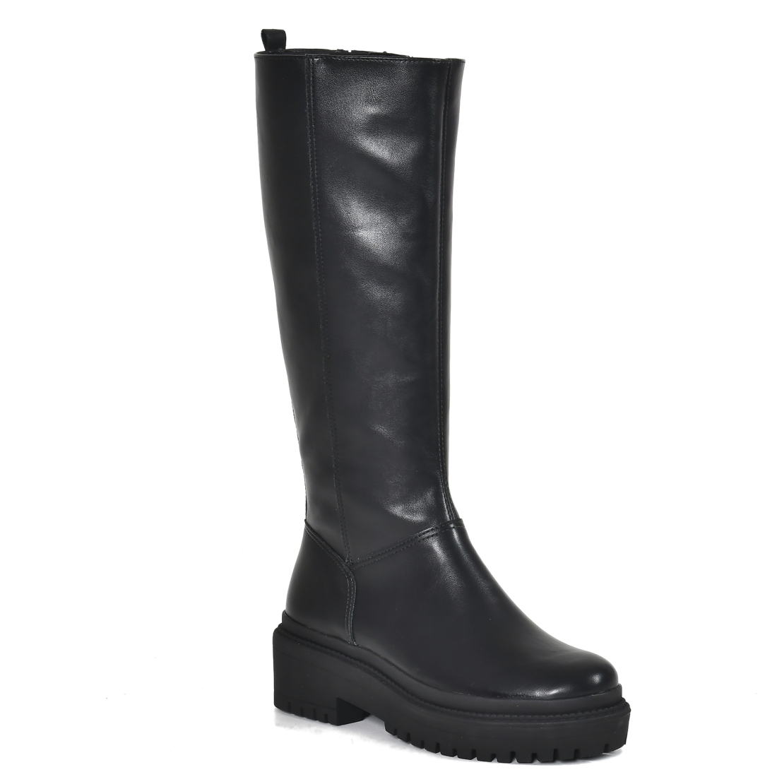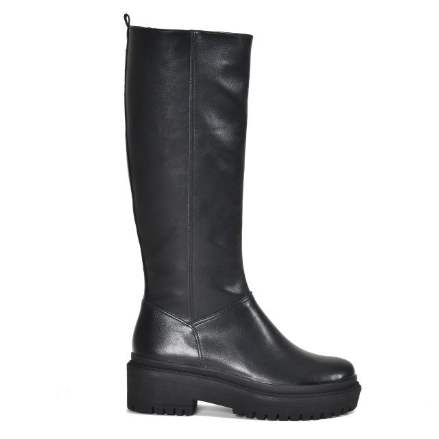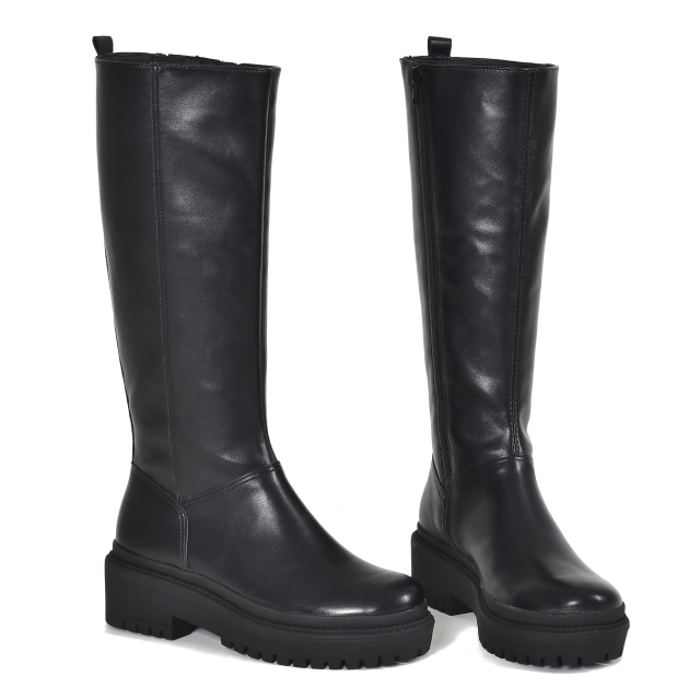 Confeccionada em material sintético napa de alta qualidade, ela se ajusta à perna com perfeição. O prático zíper na lateral interna facilita o calce, enquanto a plataforma de 5,5 cm, apesar de robusta, foi projetada para garantir conforto e estabilidade. É a união ideal entre design imponente e bem-estar.