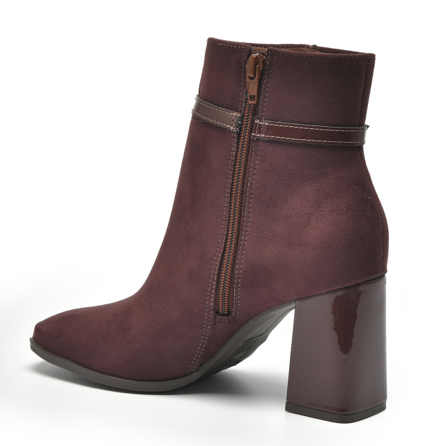 Diferenciais: Mix de texturas (camurça e verniz), salto alto envernizado.