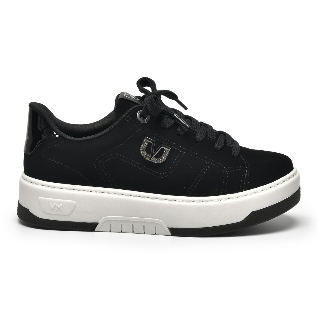 Diferenciais: Logo “VM” lateral com aplicação de cristais (strass) e detalhe em verniz no calcanhar.