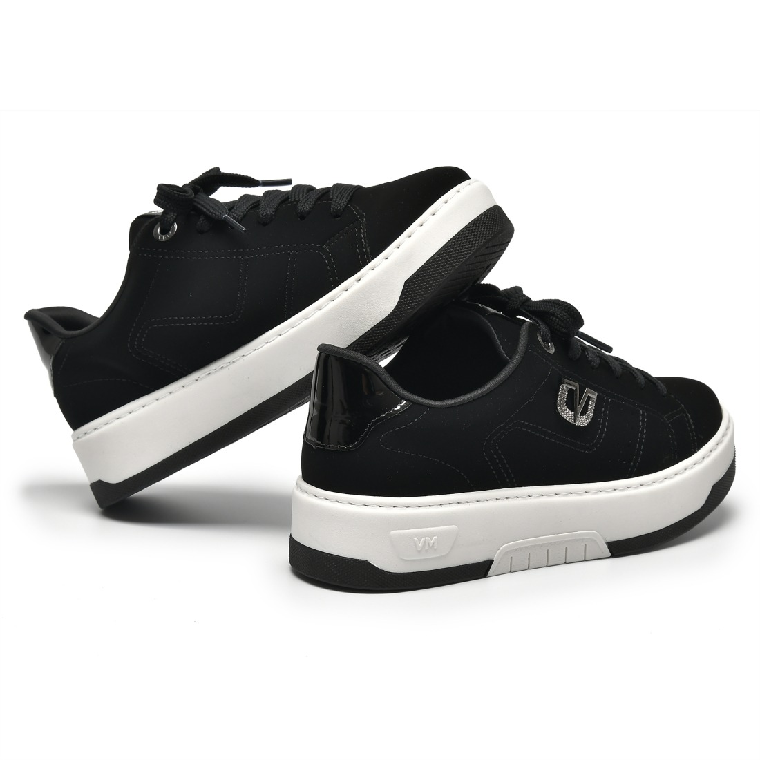 Eleve seu look casual a um novo nível de sofisticação com este tênis Via Marte. O modelo combina a textura aveludada do nobuck preto com o brilho surpreendente do verniz no calcanhar. O toque final de glamour fica por conta do logo “VM” cravejado de cristais na lateral, um detalhe que captura a luz e os olhares por onde você passa.