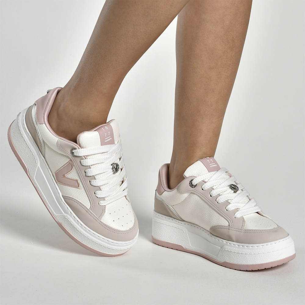 O estilo urbano encontra a delicadeza dos tons pastel neste Tênis Street da Via Marte. Com uma pegada retrô super charmosa, o design se destaca pela sofisticada combinação de cores, que une o off-white com recortes em bege e no romântico rosa “Blush Rose”. É a peça perfeita para adicionar um toque feminino e moderno aos seus looks.